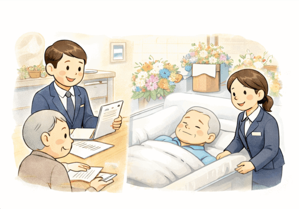 - 死亡時の対応(ご遺体お迎え、遺品の引き取り)葬儀、埋葬